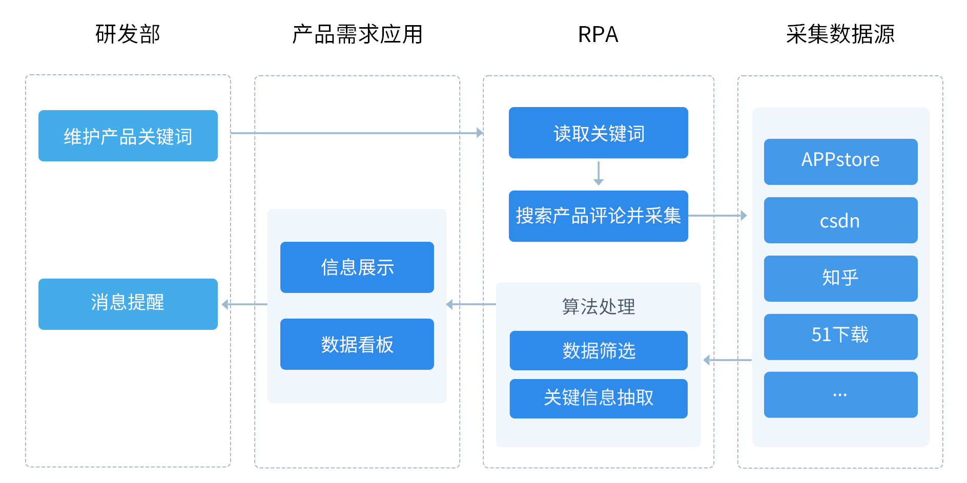公司内部信息系统中协作区、聊天区、 一些流程中都包含对公司的产品建议,如何利用机器人快速抓取这些信息?研发部对信息采集的需求如下:
